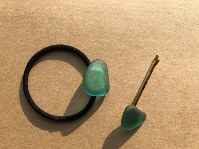 シーグラスサイズ ヘアピン 1.7cm×1.5cm ヘアゴム 2.5cm×1.8cm *シーグラスや陶器は、加工をしていない自然のまま。すべて一点ものです。 No.122
